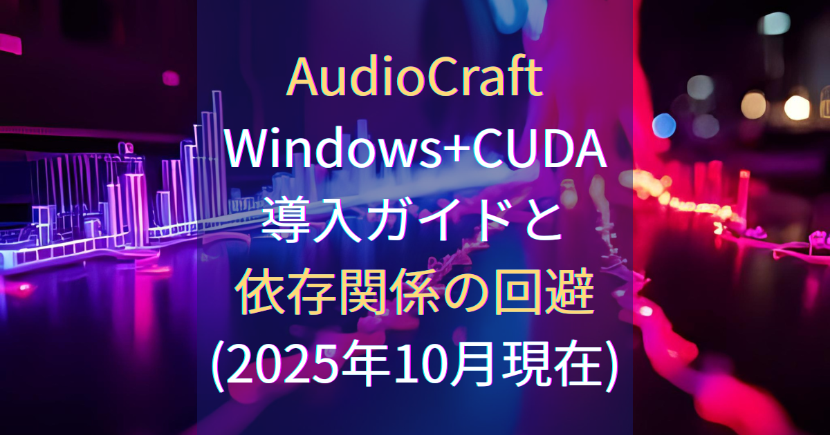 音楽生成ができるMusicGen、また効果音生成ができるAudioGenなどが含まれています。 GPU推奨ですが、Windows環境ではPyTorchやCUDAのバージョン不一致によるトラブルが多く、安定構築が難しいのが現実です。 本記事では、2025年10月時点で実際に動いた組み合わせを参考として紹介します。