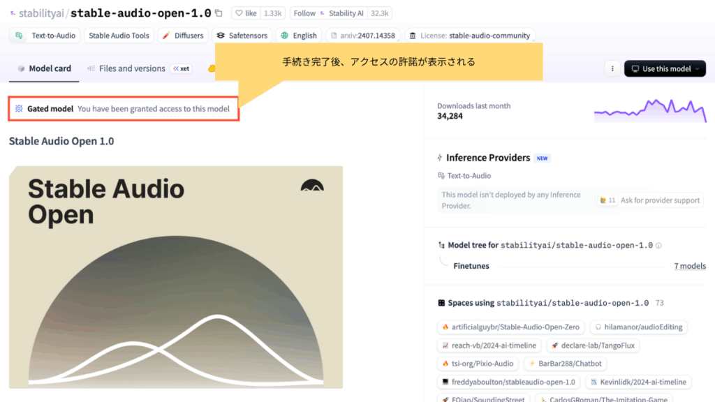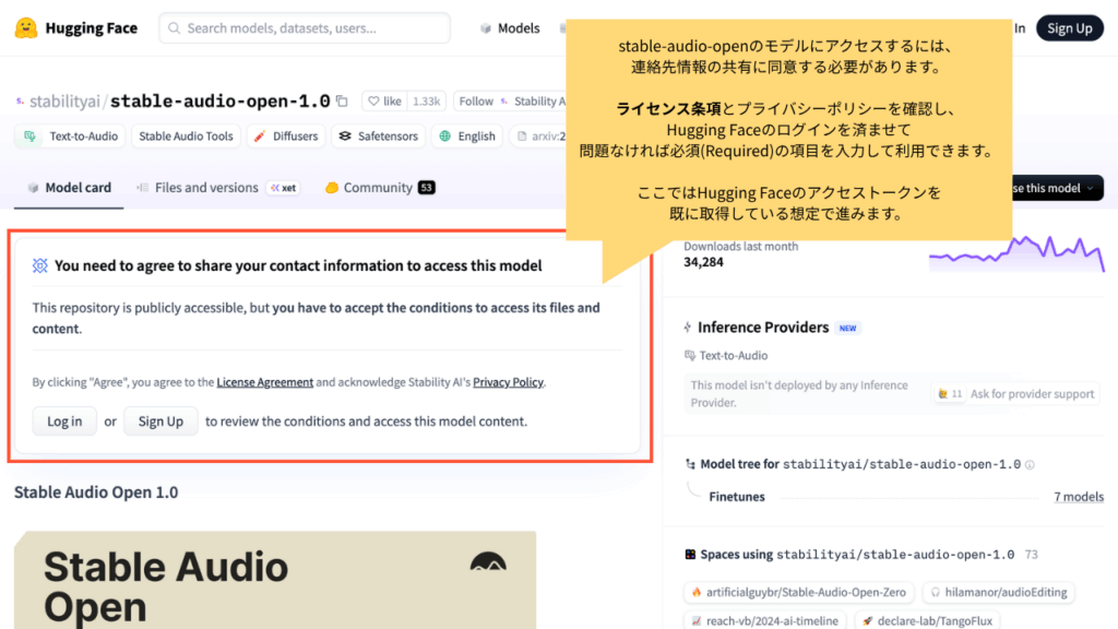 Stable Audio Openのモデルは「ゲート付きリポジトリ(Gated Repo)」となっており、Hugging Faceアカウントでの「利用のための連絡先共有・同意」が必要です。