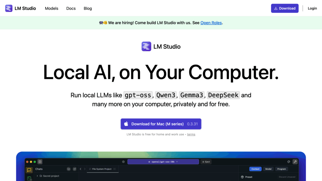 LM Studioは、Element Labs社が提供する「ローカルLLMの統合クライアント」です。 ChatGPTなどブラウザ経由のクラウドサービスではなくネイティブアプリとして動作し、次のような機能をまとめて提供します。