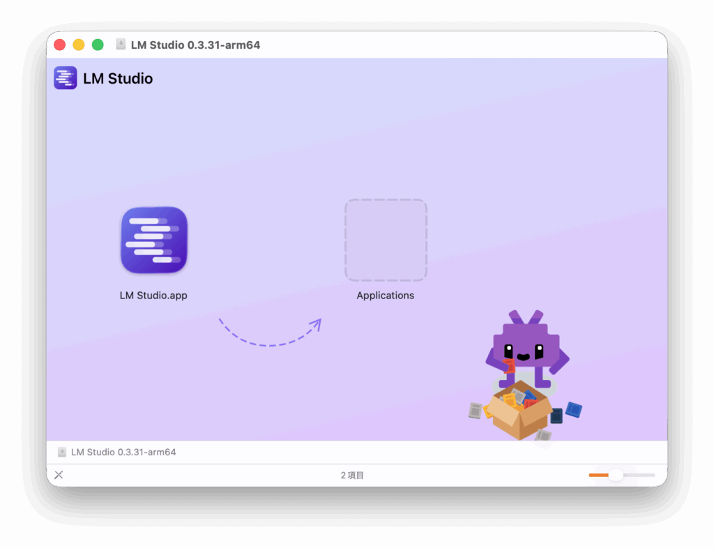 画面に表示されている LM Studio.app をApplicationsフォルダにドラッグ&ドロップ します。
