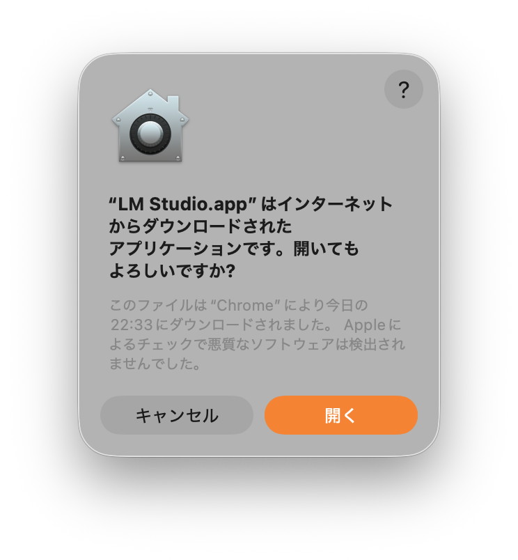 初回起動時は、インターネットからダウンロードしたアプリである旨の警告が表示されることがあります。その場合は、macOSの案内に従って開くことを許可してください。