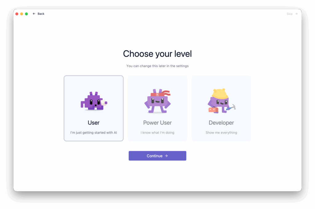 ここでは User / Power User / Developer などの選択肢があり、選んだレベルによって表示されるメニューや説明の詳しさが変わります。