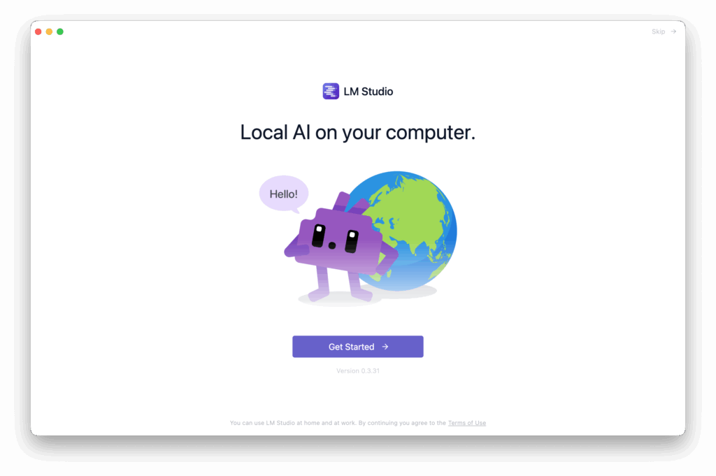 「Get Started」ボタンを押すとセットアップが始まります。もし設定をスキップしたい場合は「Skip」を選んでも構いませんが、ここでは一通り進めておくと全体像がつかみやすくなります。