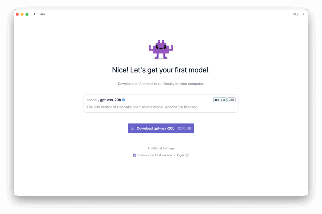 この記事では、案内に従って gpt-oss-20b をそのままダウンロードする流れを例にします。