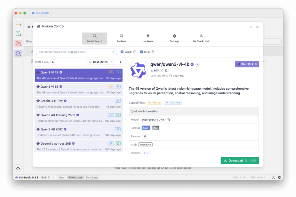 また、モデルのダウンロードや切り替えもGUI上で完結するため、「どこからモデルを取ってくるのか」「設定ファイルをどこに置くのか」といった悩みがほとんどありません。パラメータ数や量子化のバリエーションの表示もわかりやすく、一覧性が良いのが特徴です。