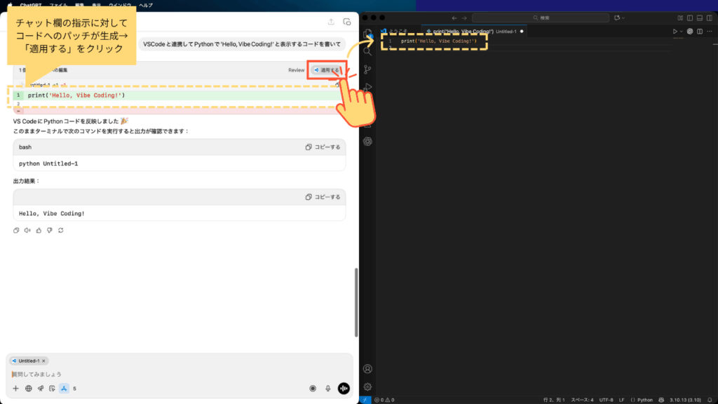 VSCodeで開いているファイルへのパッチが生成されますので、「適用する」をクリックすると反映されます。もちろん、VSCode新規ファイル(例:hello_vibe.py)を作成し、生成されたコードを貼り付けて実行でも構いません。