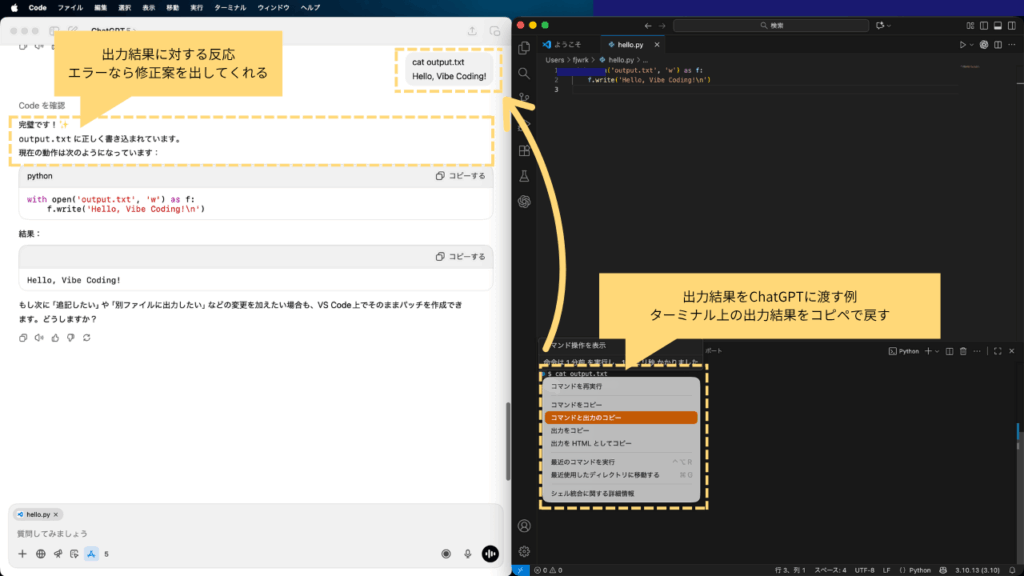 ChatGPTに「Pythonで ’Hello, Vibe Coding!’ と表示するコードを書いて」と依頼します。