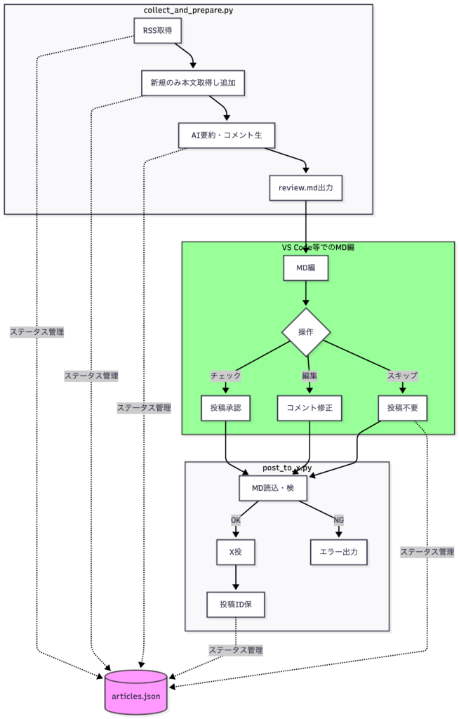 new: RSS取得で新規URL検出fetched: 本文取得完了ready: AI要約・コメント生成完了、レビュー待ちposted: X投稿完了skipped: ユーザーがスキップ指定