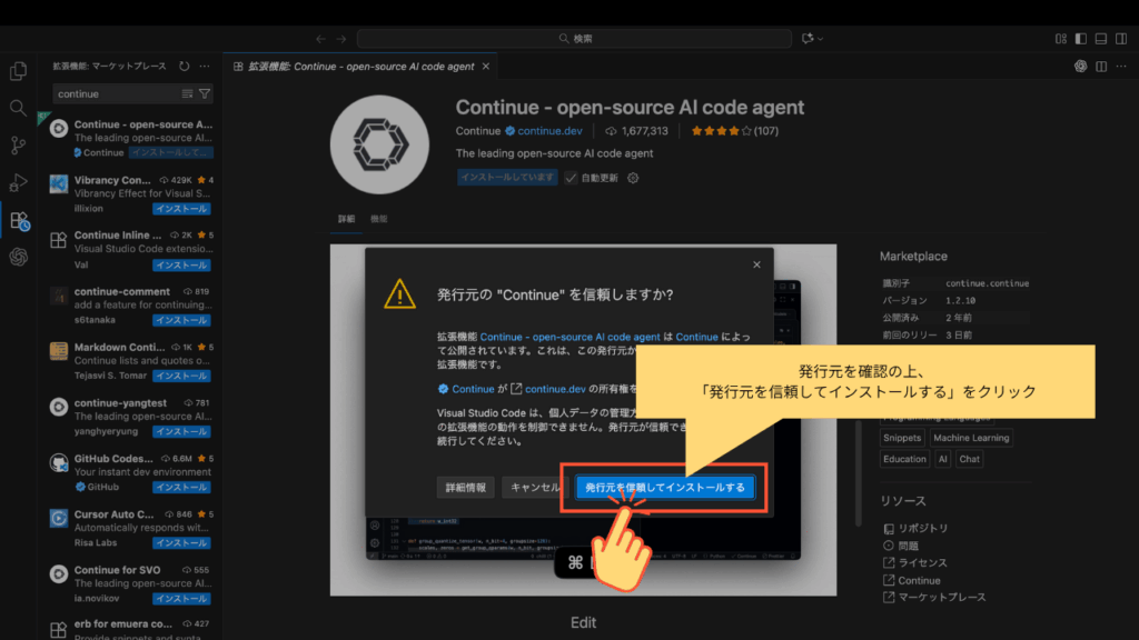 - 検索バーで「Continue」を検索し、「インストール」ボタンを押します。
