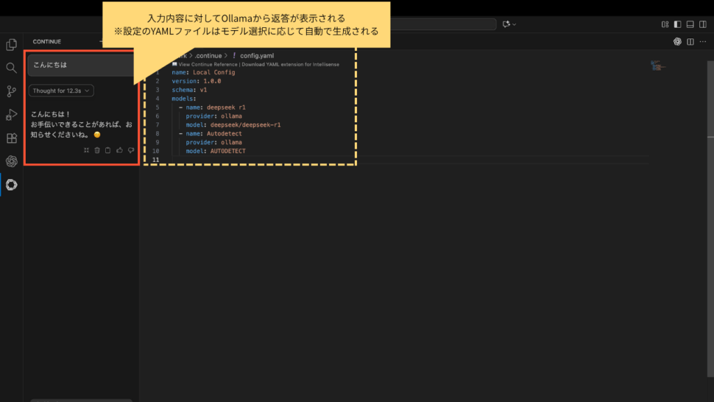 デフォルトではOllamaやVSCodeに特別な設定は不要ですが、独自の設定を行った場合はconfig.yaml等の調整を行います。