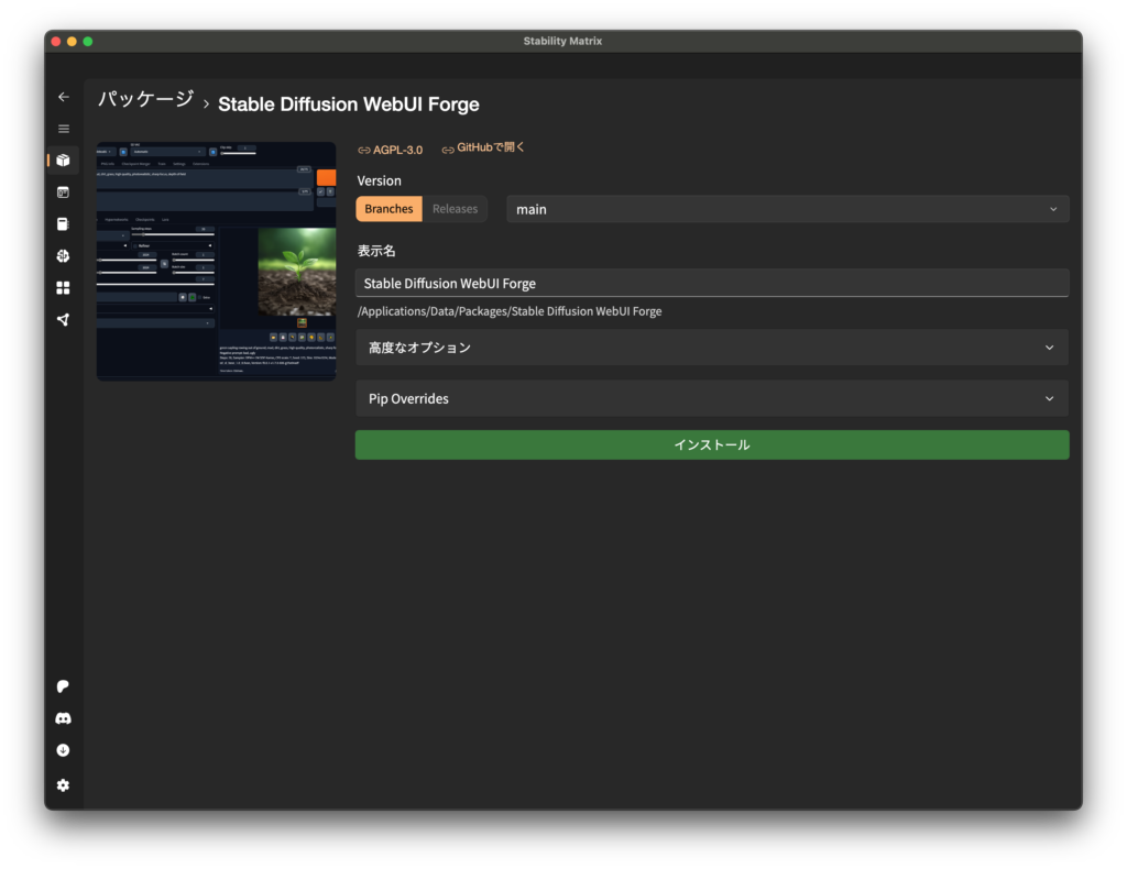 3. 起動した Stability Matrix で、もう一度 Stable Diffusion WebUI Forge のインストールを実行。
