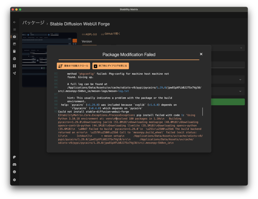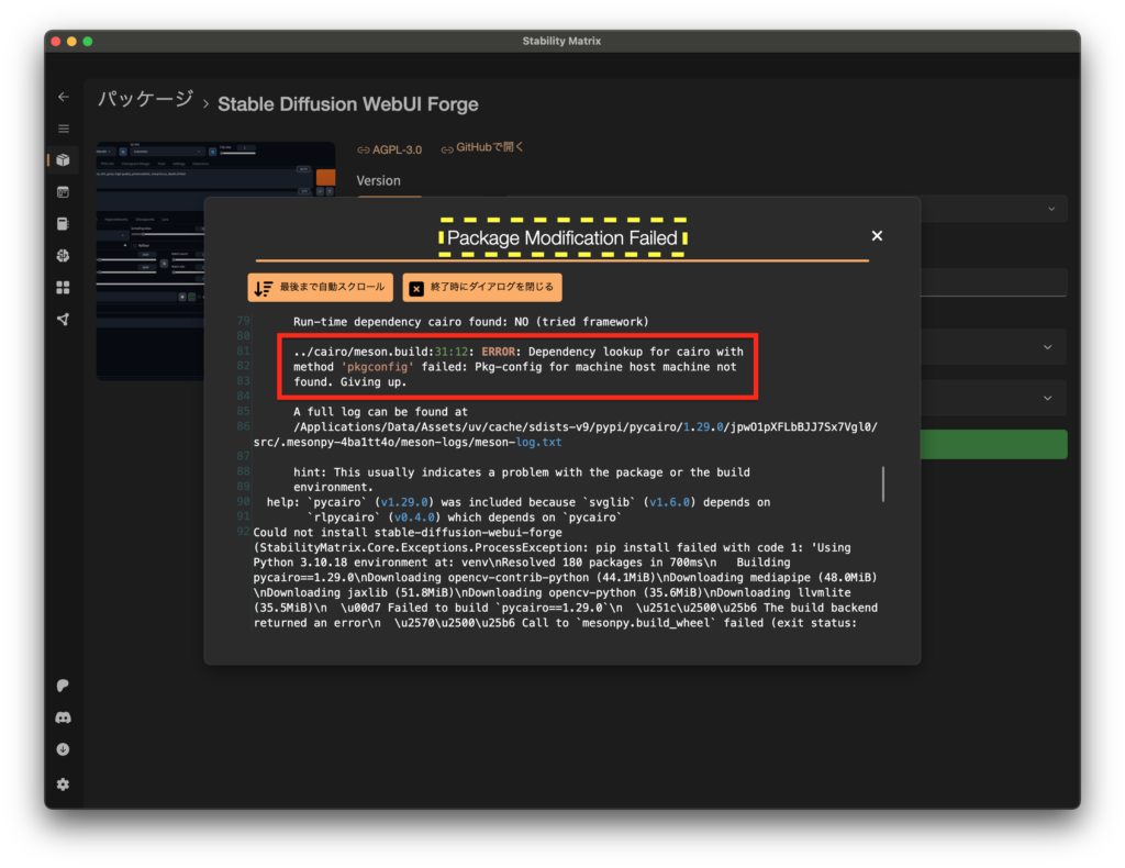 → そのせいで pycairo のビルドに失敗 → 連鎖して stable-diffusion-webui-forge のインストールが失敗