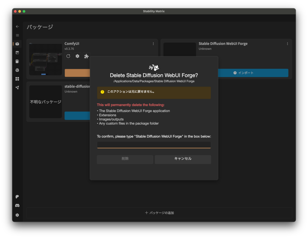 ちょっと怖そうな案内が表示されますですが、入力欄に確認のため”Stable Diffusion WebUI Forge”と入力すれば無事に消えます。なお、インストールの進み具合でパッケージ名の認識が異なるようで、手順は同じですが、もう1つ残骸では違う文字列の入力を求められました。