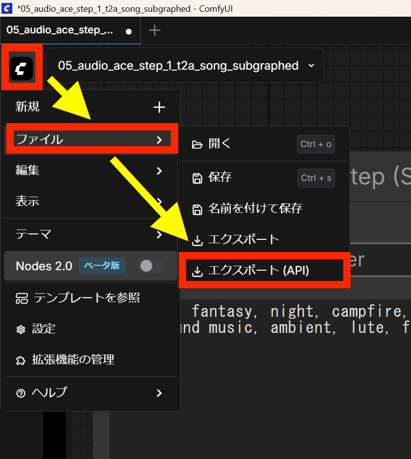 Comfyメニューからエクスポートします、手順は以前にACE-Stepで紹介した手順と同様です。