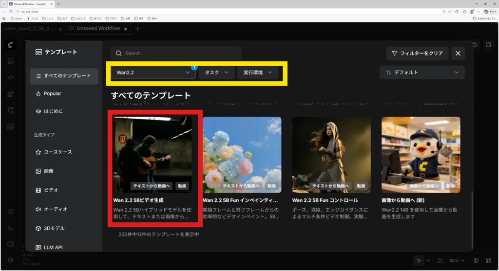 ComfyUIを起動し、Wan2.2に対応したテンプレートを検索します。