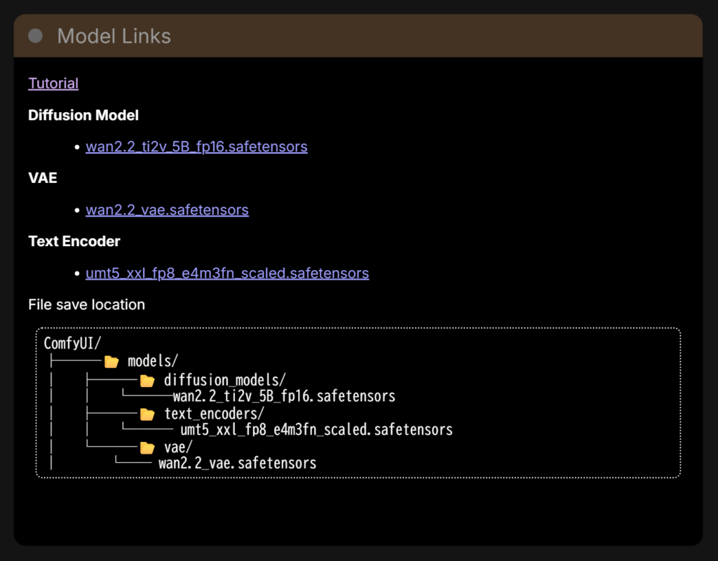 ワークフロー左上には簡単な解説が表示されていますが、ここで示されているフォルダ構成はあくまで一例です。Stability Matrix から導入した場合は、配置手順を一部読み替える必要があります。