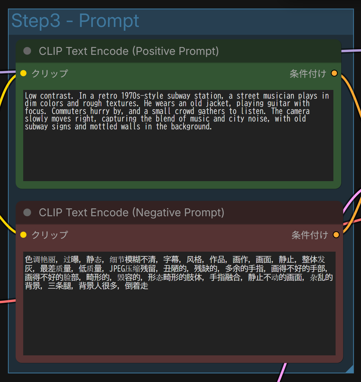 最も重要なのはプロンプトです。ワークフロー上、下記のポジティブプロンプトとネガティブプロンプトの場所をメモしておきましょう”Step3 – Prompt”や、”Positibty Prompt”等を覚えておき、JSON上で当たりをつけられるようにします。