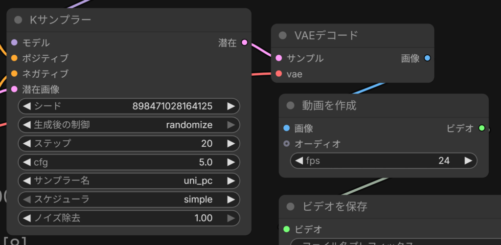 この他、デフォルトの設定値では動画の生成にかなり時間がかかる(試した環境では数時間レベル)ので、画像サイズやfps、推論のステップ数など軽く試すためのパラメータを抑えておくとよいでしょう。