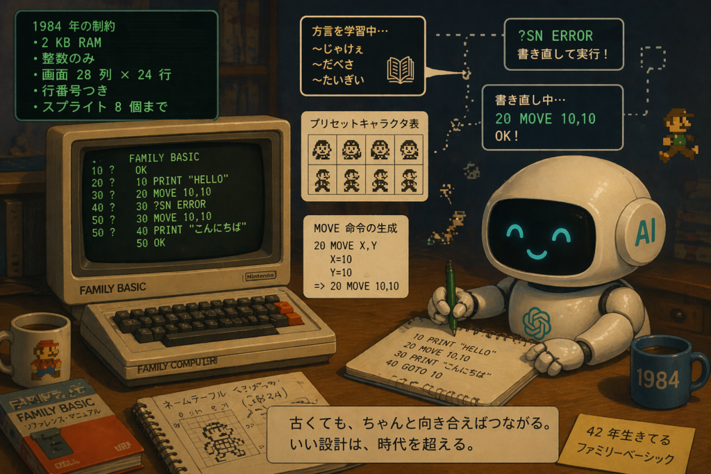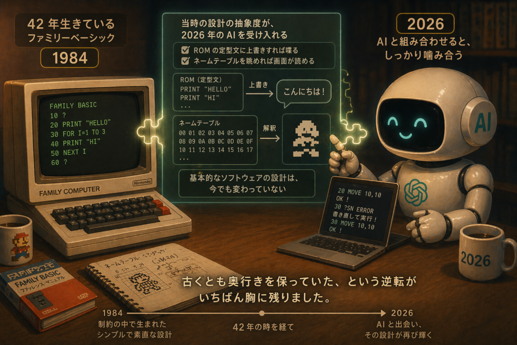 そして忘れてはならないのは、この実験の相手——ファミリーベーシックの側——が、すでに 42 年生きている ということです。2026 年の AI を組み合わせたとき、それを受け入れるだけの抽象度を、当時の開発者たちはすでに持たせていたとも言えます。ROM の定型文に上書きすれば喋るし、ネームテーブルを眺めれば画面が読める。基本的なソフトウェアの設計は今でも変わっていません。そういう素直な設計のマシンだからこそ、現代の AI とも噛み合います。古くとも奥行きを保っていた、という逆転が、この連載を通じていちばん胸に残りました。