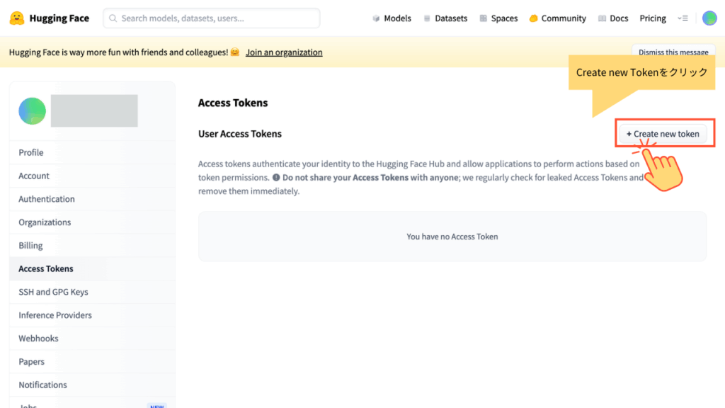 Hugging Faceにログイン後、右上のアイコンをクリックし、「Access Tokens」を選択します。