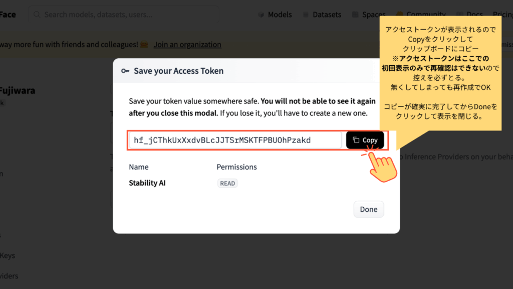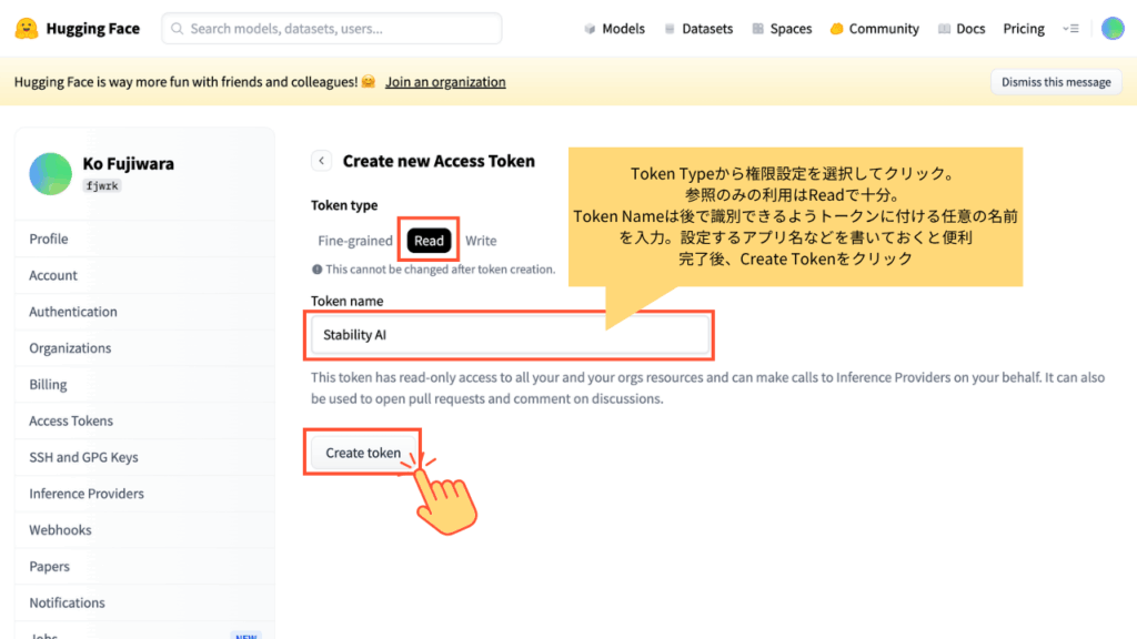 モデルをローカルで実行したり、Stable Audioなどの生成AIを利用する際には、「アクセストークン」の取得が必要になります。
