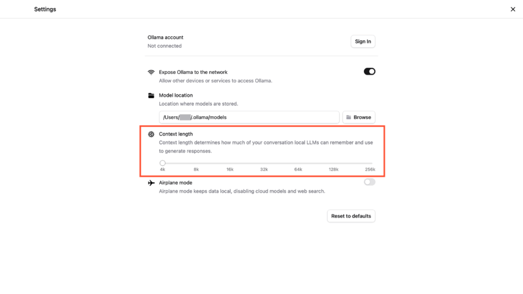 Ollama設定画面の “Context length” スライダーは、アプリ全体で使用する num_ctx の目安・初期設定値を示しています。ただし、実際に有効となる最大文脈長は、モデルがサポートする仕様とハードウェアメモリ状況によって決まります。
