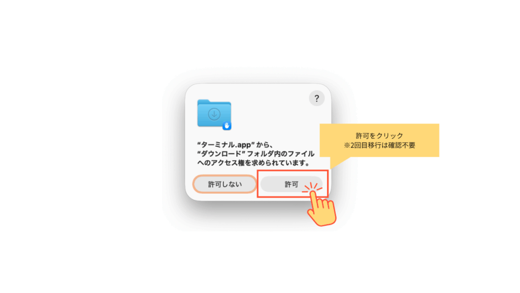 - 「許可」 を選択すると、Terminalからこれらのフォルダへのアクセスが許可され、操作が正常に行えます。