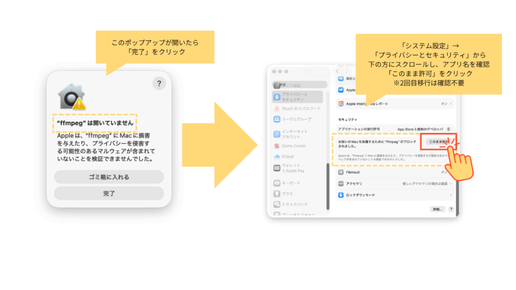 macOSで「“〇〇は開いていません”」という警告が出た場合は、システム設定から解除できます。
