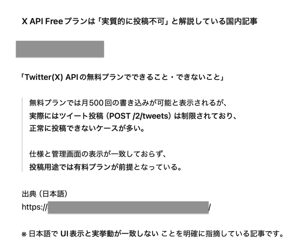 これは今回の環境でたまたま起きた事象かもしれませんが、Xのような有名なサービスでもハルシネーションが起こることは注意が必要です。有名サービスについては一般に情報の精度が高いのですが、AIの回答を鵜呑みにせず、仕様を確認する重要性を再確認しました。