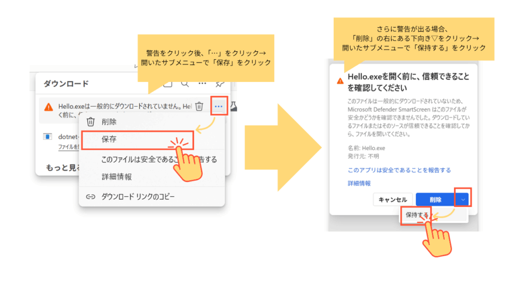 → 「システム設定」→「プライバシーとセキュリティ」 で「このまま開く」等の明示的許可が必要。 - Windows:SmartScreenは“強い警告”だが、ダイアログ内の操作で実行に進める(設定アプリを開く必要は通常ない)。