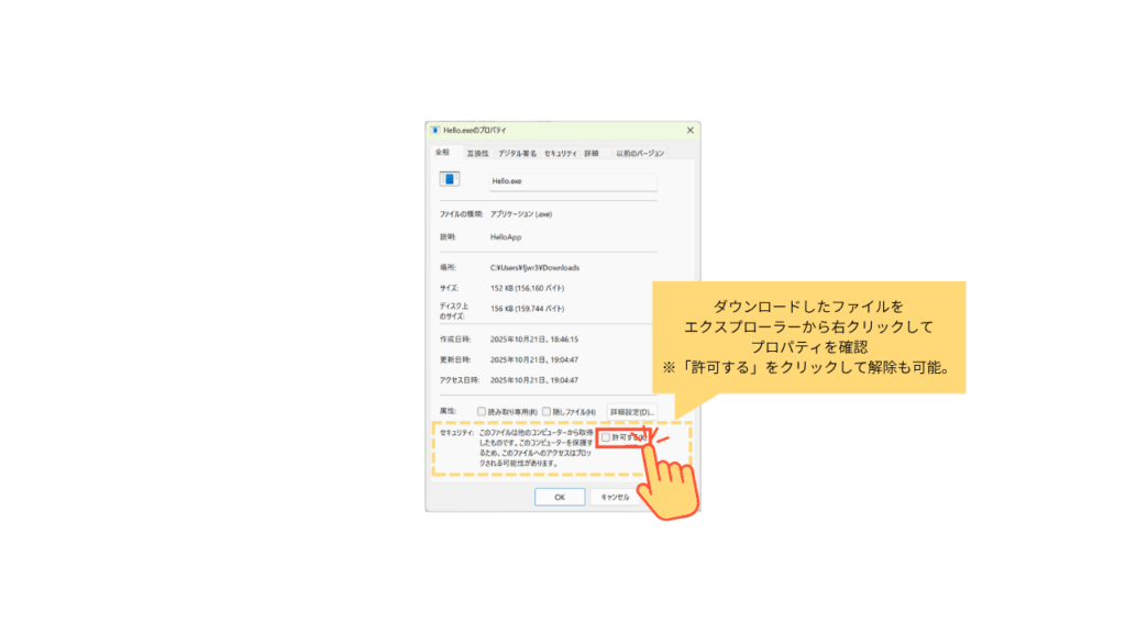 これで Zone.Identifier 属性が削除され、ファイルは「信頼済み」として扱われます。SmartScreen のポップアップ操作([詳細情報]→[実行])だけではこの属性は解除されませんので、プロパティで明示的に解除する必要があります。