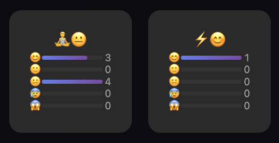 前回紹介したように、HigherSelfではToDoを始める前の感情と、完了時の感情を分けて記録できる仕組みにしています。集計結果はウィジェットで表示されます。(下記はサンプルで数字はダミー)