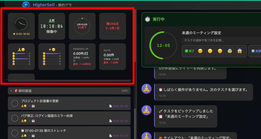 ダッシュボードは自分を映す「鏡」です。「今日の進捗40%」と見えれば、もう少しやろうという気になる。100%に近ければ安心して休める。感情の分布が偏っていれば、タスクの配分を見直すきっかけになる。