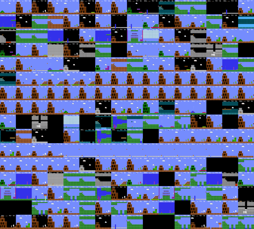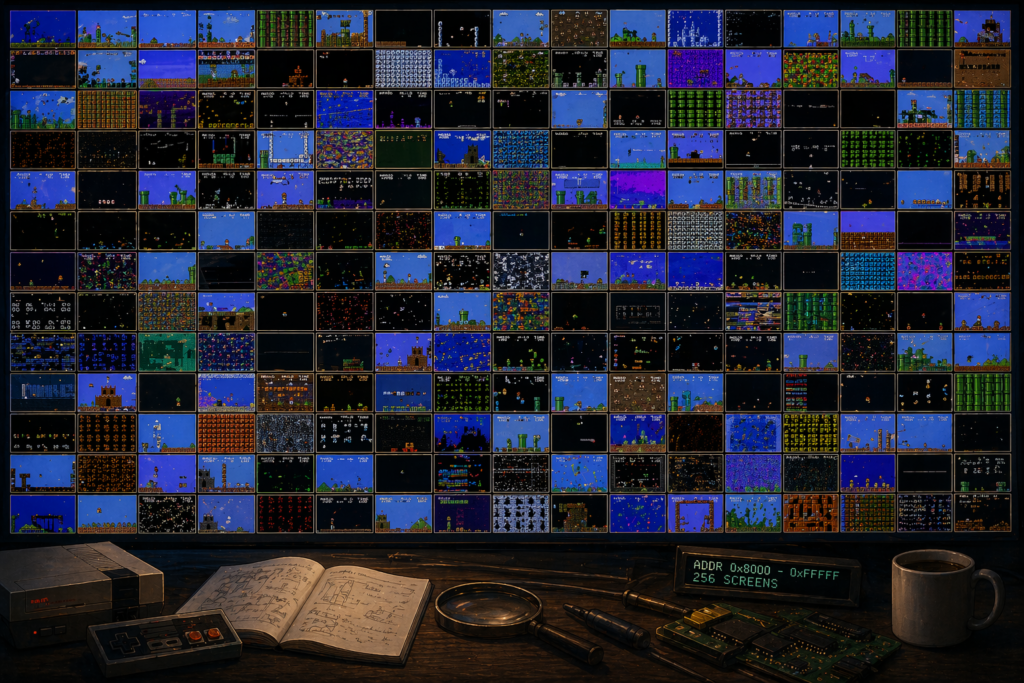 前回、スーパーマリオブラザーズの 9-1 以降——通称 256W——を nesemu の外部制御で全面踏破しました。壁にクリボーが埋まり、土管が空に浮かぶ、壊れた地形ばかりの 248 面ぶんの画像と動画を手に入れたところで終わっています。