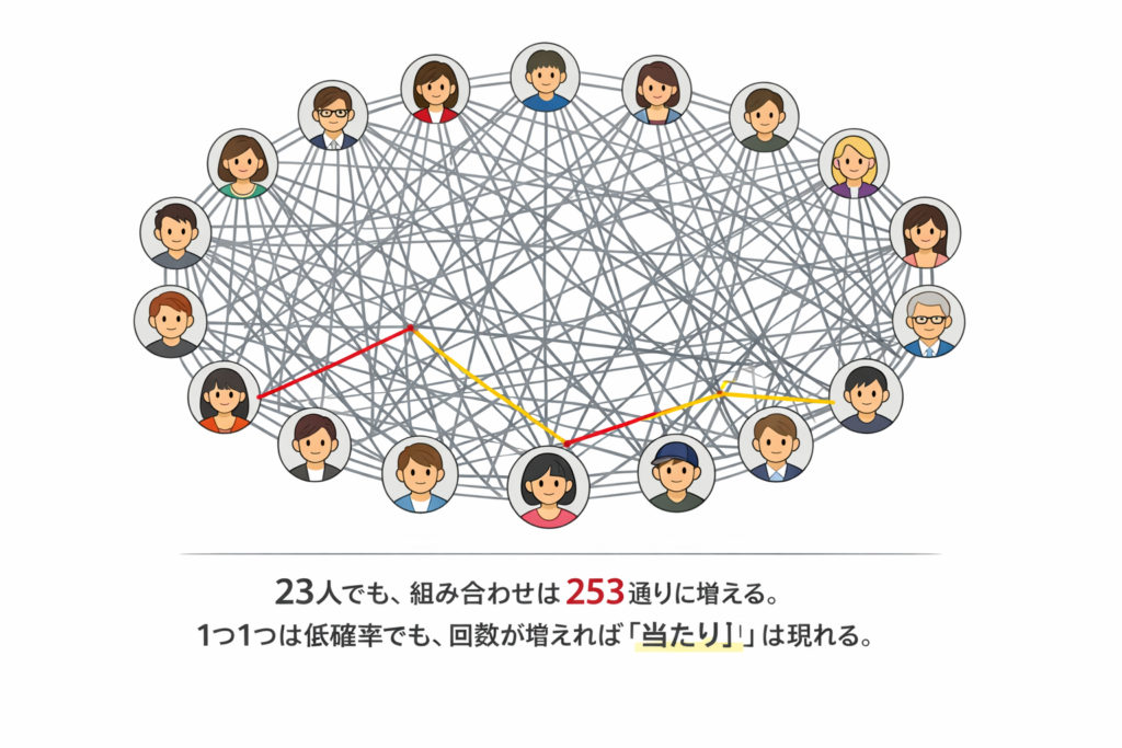 仕組みは単純です。23人の中から2人を選ぶ組み合わせは253通りあります。それぞれの組が誕生日を共有する確率は低くても、253回の試行を重ねれば、少なくとも1組は当たる確率が50%を超えるのです。